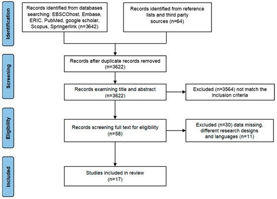 There are 3706 articles according to all databases, including EBSCOhost, Embase, ERIC, PubMed, Scopus, Springerlink, and Google Scholar. Further, 84 articles were removed because of duplication, and 3622 articles remained for further screening. After examining the title and abstract, 3564 articles were eliminated because they did not match the inclusion criteria. Then, 58 full-text articles were investigated, and 41 articles were excluded because of missing data, different research designs, and languages. Finally, 17 articles met all characteristics required in this study (Figure 1).
