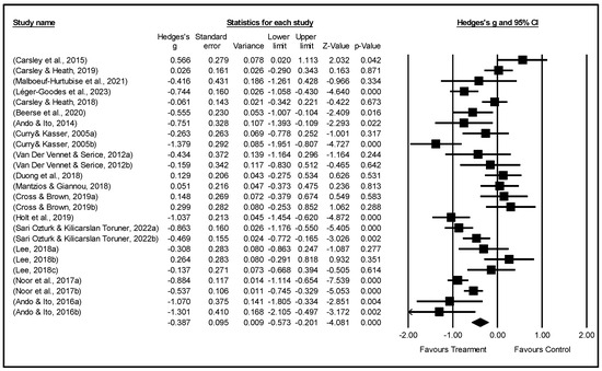 Effect sizes were determined using mean and standard deviation estimates. When means and standard deviations were not accessible, t and p statistics were used to calculate effect sizes. Each outcome variable had a single effect size when numerous instruments were used to evaluate the same outcome (Thalheimer & Cook, 2002). Each study’s effect size was calculated using Hedges’ g and included the associated p-value and its 95% confidence interval (CI). The selection of Hedges’ g was based on its reduced bias for predicting effect sizes in small sample sizes (Hedges & Olkin, 2014). Data for outcome variables were combined for meta-analysis using the random-effects model. Cohen’s paradigm of effect sizes, with values of 0.2 for small, 0.5 for medium, and 0.8 for large, was used to evaluate the effect size.