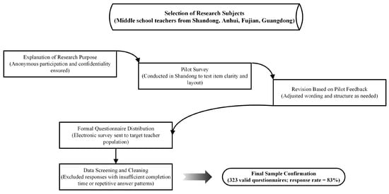 A total of 388 questionnaires were distributed. Invalid answers with problems such as insufficient answering time or choosing the same option for most questions were excluded. As a result, 323 valid sample data were obtained, with an effective response rate of 83%. The detailed procedure for data collection is illustrated in Figure 2. The sample consisted of 61.6% female and 38.4% male participants. Most respondents were aged 26–55, with the largest proportions in the 36–45 and 46–55 age groups (each 27.6%). Teaching experience varied, with 32.8% having 0–5 years and 31.9% over 20 years. The majority held a bachelor’s degree (83.3%), followed by a master’s (13.9%). Regarding school type, 57.9% of participants worked in senior high schools, while 42.1% worked in junior high schools.