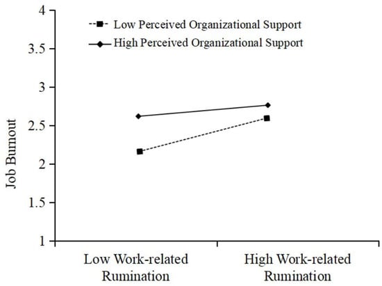 Perceived organizational support moderates the relationship between work-related rumination and job burnout, such that this relationship will be weaker when perceived organizational support is high than when it is low.