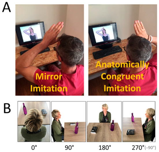 - Cracco, E., Bardi, L., Desmet, C., Genschow, O., Rigoni, D., De Coster, L., Radkova, I., Deschrijver, E., & Brass, M. (2018). Automatic imitation: A meta-analysis. Psychological Bulletin, 144(5), 453. [Google Scholar] [CrossRef]