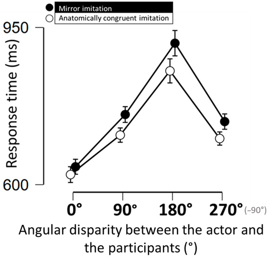 Data are available at https://osf.io/n3wge/ (accessed on 9 February 2020). For the computerized visuospatial perspective-taking task, trials were excluded from the response time analysis when a participant responded erroneously (2.8% of the data) or if response times were shorter than 300 ms or more than 3 standard deviations away from the median (2.7% of the data) computed for each participant (Leys et al., 2013). We chose to use a mixed linear model to process the response time data. This model is advantageous with respect to ANOVA since it takes into account fixed effects (the “real” effects we want to study) as well as random effects (each subject may have their own intercept in the linear relation between RT and independent variables). For categorical variables such as the condition “anatomically congruent” vs. “mirror” imitation, the fitted parameter was evaluated as the slope parameter in RT between a chosen reference (here “anatomically congruent”) and “mirror”. The orientation variable with four modalities (“back” 0°, “face” 180°, “left” 90°, and “right” 270°) as treated by choosing “back” as reference, and 3 fitted parameters were evaluated as slope parameters between “face” and “back”, “left” and “back”, and “right” and “back”. As a direct consequence, in mixed linear model, effect sizes are given by these parameters (directly expressed in ms) and their 95% confidence intervals (also expressed in ms). A floor effect was observed for accuracy performance, with participants making very few errors (typically 0, 1, or 2), resulting in a high frequency of zero scores. Due to this limited variability, particularly at the trial level, fitting a mixed-effects model with subject-level random effects would have been unreliable or prone to convergence issues. Therefore, an ANOVA was conducted with “imitation condition” as a between-subject factor and “orientation” as a within-subject factor, and effect sizes were indexed using partial Eta-squared (ηp2). Other between-group comparisons were conducted with standard T-tests and their respective effect size estimated using Cohen’s d and their 95% confidence intervals. Bonferroni’s correction was applied for post hoc comparisons.