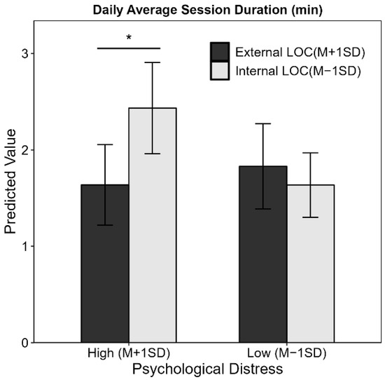 The moderation effect of locus of control in the relationship between psychological distress and daily average session duration. The daily average session duration is calculated by dividing the total smartphone use time by the number of smartphone use sessions. LOC = locus of control. * p < 0.05.