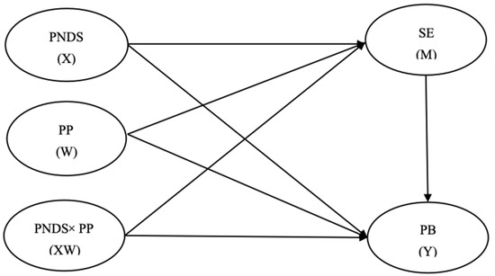 Proposed moderated mediation model. Note: PNDS = perceived neighborhood disorder; PP = positive peers; SE = self-esteem; PB = prosocial behavior.