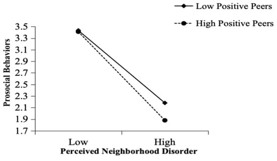 Positive peers moderate the relationship between perceived neighborhood disorder and adolescent prosocial behavior. In other words, adolescents supported by positive peers may exhibit more prosocial behaviors even in adverse neighborhood environments.