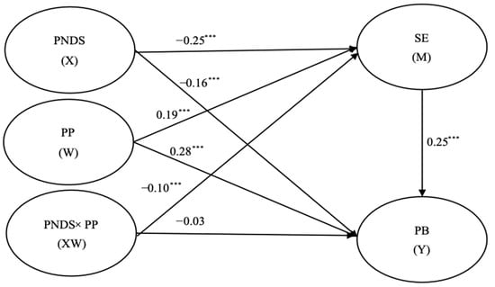 Moderated relationship model. Note: PNDS = perceived neighborhood disorder; PP = positive peers; SE = self-esteem; PB = prosocial behavior; *** p < 0.001.