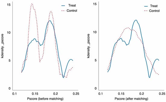 The quality of matching would directly affect the final estimation results. Ideal matching should satisfy both the common support condition and the balancing hypothesis. Typically, the common support condition is met when each treated unit has a comparable control unit with a similar propensity score, whereas the balancing hypothesis requires that the characteristics of the matched treated and control groups are balanced, with no significant differences ().