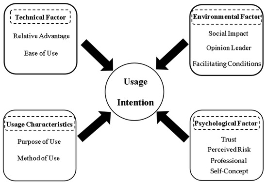 Axial coding refers to the formation of categories through a process of further organizing and integrating open codes. This process aims to identify and establish internal relationships between different categories through cluster analysis to build a more rigorous and organic classification system (Barsalou, 2008). In this study, the 11 initial categories that were identified during open coding were further condensed and refined into five main categories: technical factor, environmental factor, usage characteristics, psychological factor, and usage intention, as shown in Appendix B.