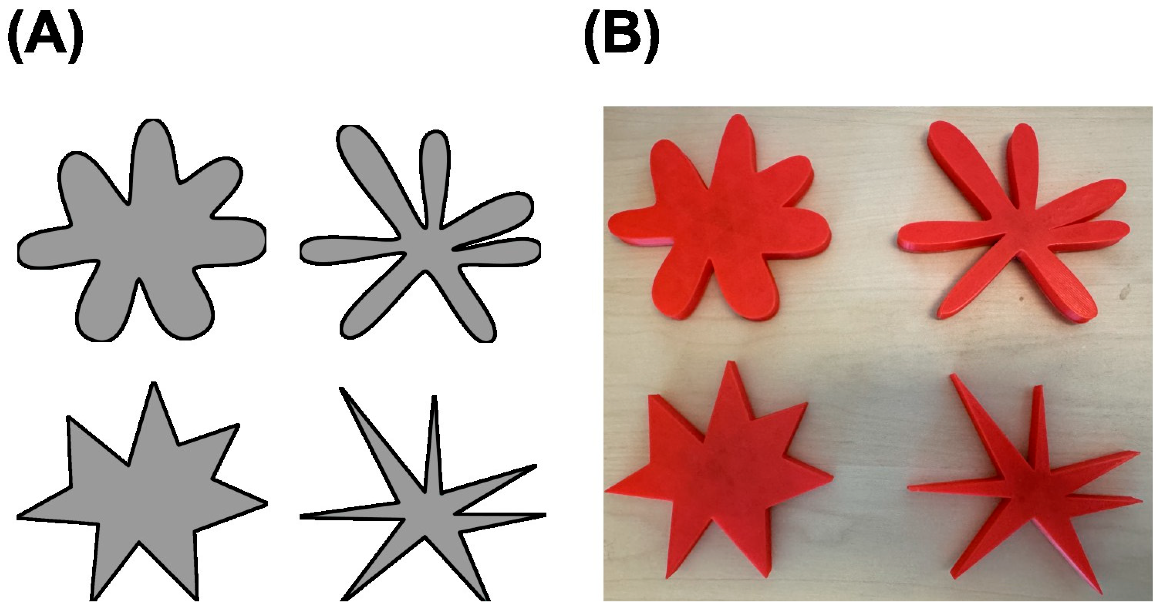 Figure 1. Two-dimensional (A) and three-dimensional (B) abstract shape pairs used for visual and haptic exploration. Each pair included one round and one spiky shape, with the top pair having thicker protrusions and the bottom pair having thinner protrusions. Protrusion size was held constant across all conditions; only the contour spikiness, round versus spiky, of the shape varied between the paired stimuli (adapted from Cao et al., 2024).