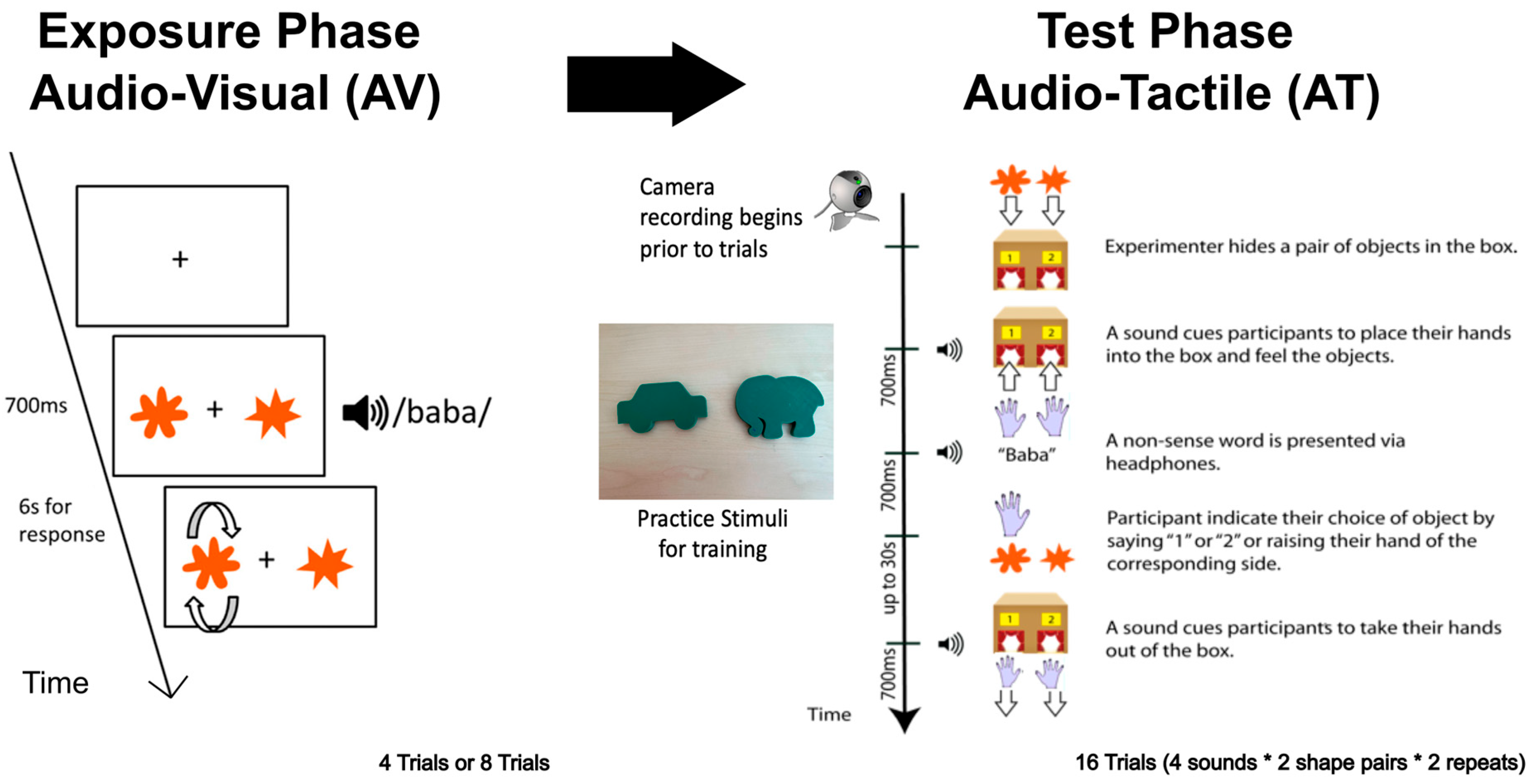 Figure 2. Experimental procedures. Participants were randomly assigned to either 4 trials or 8 trials of AV prior exposure. During the AV exposure phase, participants were asked to pick the visual shape shown on a computer screen that best matched the nonsense sound they heard. After the exposure phase, participants completed 16 trials of AT sound–shape correspondence. For each AT trial, a sound cued participants to place their hands in the box, and then participants heard a nonsense sound (700 ms)—“baba”, “gaga”, “titi”, or “kiki”—while feeling two opposing tactile shape pairs. Participants had up to 30 s to select which shape best matched the sound. After participants indicated their choice verbally or by raising their hand on the side corresponding to where they felt the matching shape, a sound cued them to take their hands out of the box. Each participant completed a total of 16 trials (4 nonsense words × 2 pairs of shapes × 2 repeats).