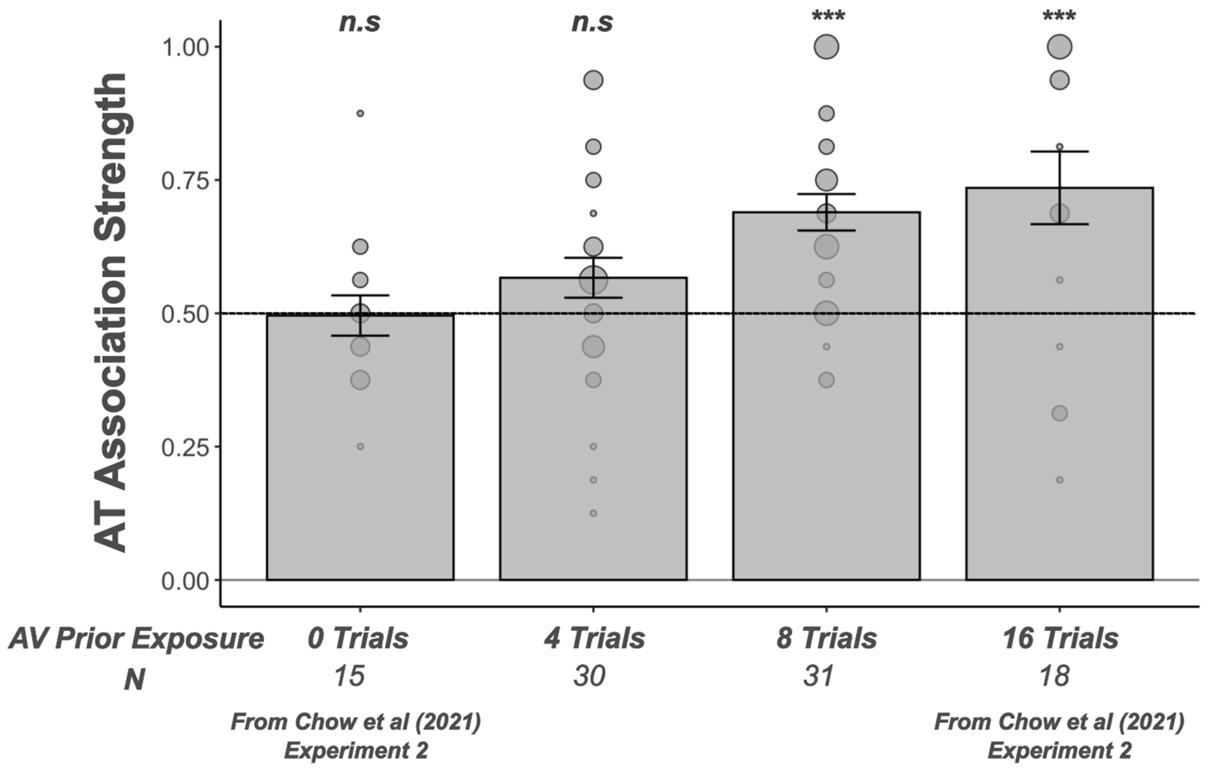 Figure 3. Audio–tactile (AT) association strength for 0, 4, 8, and 16 trials of AV exposure. Individual AT association strength (dots with size scaled to account for number of participants at the same value) and mean AT association strength (bar plot ± standard errors across participants) results show that children with 4 trials of AV exposure did not associate nonsense words and abstract tactile shapes, whereas children with 8 trials of AV exposure showed a significant association between nonsense words and abstract tactile shapes. A subset of data from a different group of participants tested in Experiment 2 of Chow et al. (2021) also showed significant AT association following 16 trials of prior AV exposure, but not 0 trials of prior AV exposure. All participants completed 16 AT trials. N: number of participants; n.s.: nonsignificant; *** p < 0.001.