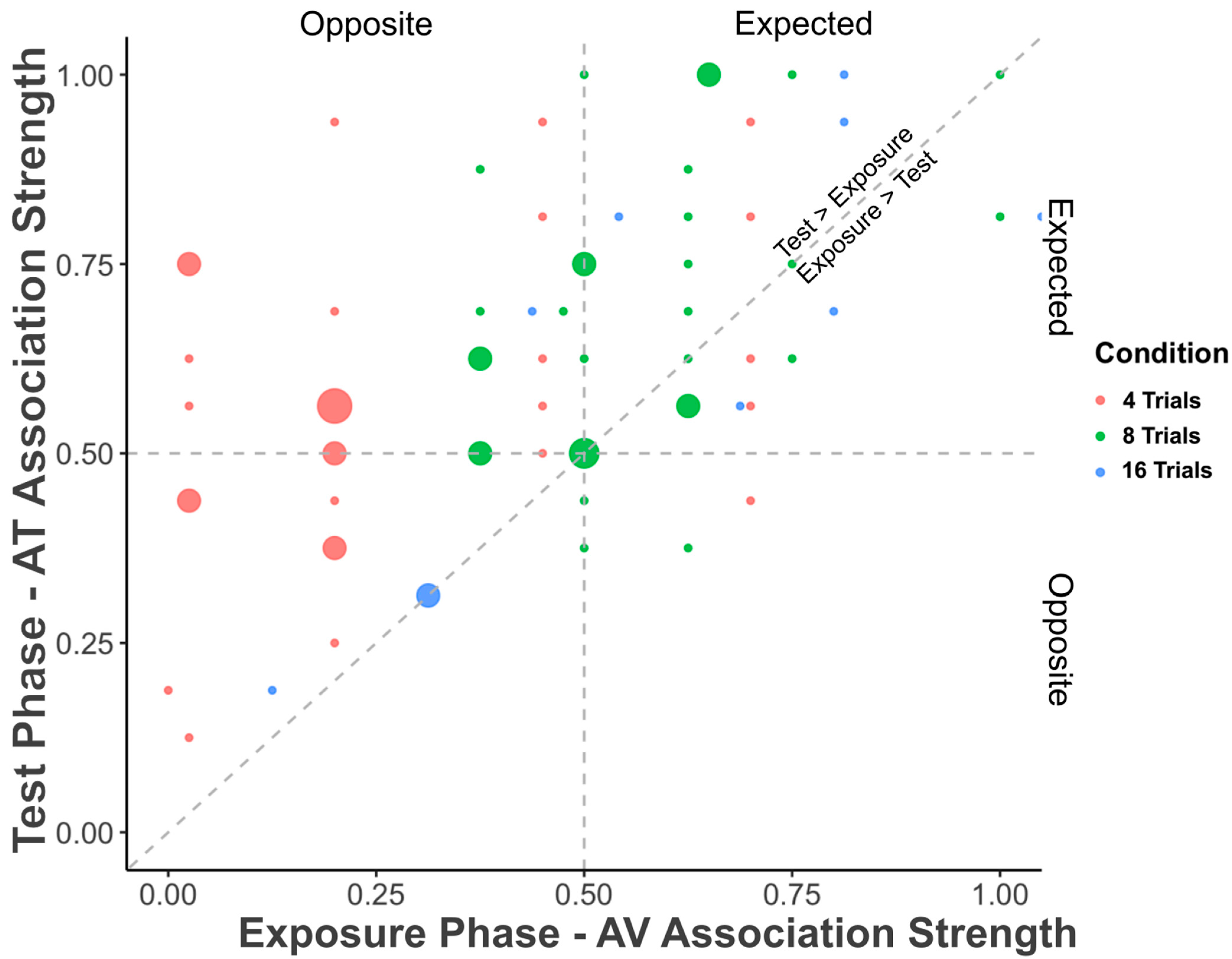 Figure 4. Relationship between the overall AV association strength during the exposure phase and AT association strength during the test phase as a function of number of trials of AV exposure. Individual association strengths are depicted for each participant by dots, which are scaled in size to account for the number of participants at the same value, with color indicating the number of exposure trials (red: 4 trials; green: 8 trials; blue: 16 trials). Participants showing stronger AV associations during the exposure phase were also more likely to show stronger AT association during the test phase.