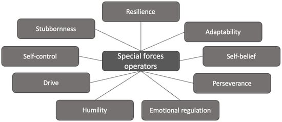 Previous researchers have also sought to understand the mindset of special forces operators. In the broader sense, mindset can be viewed as a set of situational, cognitive processes that are called forth by a given task (). In seeking to understand the mindset of special operations forces in Denmark, () suggested a framework organized into three areas: tactical proficiency (TP), organizing, and coping with complexity (CWC). For TP, the authors listed self-assured, self-reliant, physically strong, psychologically stable, focused, rigorously selected and trained, and risk tolerant. In conceptualizing “organizing”, the authors suggested informal, innovative, delegating, non-hierarchical, disregard for admin, flexible, loyal, arrogant, collaborating, competitive, and rule-breaking. CWC was characterized as being culturally aware, creative, analytical, and adopting cross-disciplinary approaches. In addition, () considered the mindset of US Navy SEALs, suggesting that the mindset of the operator is important as it can impact upon the individual’s performance in stressful situations. () specifically explored stress mindsets, suggesting a “stress is enhancing” mindset rather than a “stress is debilitating” mindset was crucial for operator success. Understanding mindset is important, as it interacts with the underpinning psychological traits to determine the nature of the individual operator.