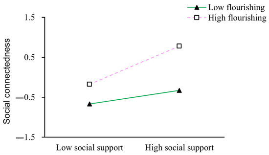Flourishing refers to an individual’s intrinsic positive psychological state that emphasizes optimal human functioning, focusing on fostering personal strengths and establishing positive social relationships (Diener et al., 2010; Keyes, 2002). This psychological state can affect the patterns and outcomes of individuals’ social interactions when they encounter life challenges. Previous empirical studies have consistently demonstrated significant associations between flourishing and both social support and social connectedness (Eraslan-Capan, 2016; Yildirim & Green, 2024). Specifically, individuals’ level of flourishing may significantly influence both the perceived intensity of social support and the degree of social connectedness with others. These findings suggest that flourishing may not only function as an independent protective resource but also interact with social support to jointly influence social connectedness. According to the protective–protective model, one protective factor can enhance the effect of another on outcome variables (Evans et al., 2010; Hollister-Wagner et al., 2001). In social contexts, flourishing and social support operate as synergistic protective factors, enhancing both the perception and utilization of external support while facilitating higher-quality social connectedness. This mechanism aligns with Fredrickson’s broaden-and-build theory of positive emotions, which posits that positive psychological states expand cognitive and attentional capacities, promoting open and inclusive interpretations of social environments (Fredrickson, 2001). Individuals with high flourishing demonstrate enhanced sensitivity to benevolent intentions in social interactions, thereby enriching their interpersonal networks. Conversely, low flourishing constrains cognitive-affective processing, predisposing individuals to skeptical appraisals and impairing the recognition of available support. Even amidst abundant social resources, such limitations hinder the formation and maintenance of social connectedness. Therefore, this study proposes H3: Flourishing may serve as a moderator between social support and social connectedness. Specifically, individuals with greater flourishing show a stronger association between social support and social connectedness.