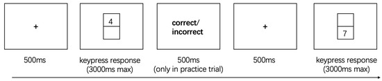The formal task consisted of two blocks, each comprising 64 trials. Each trial had a maximum response window of 3000 ms. The first trial of each block was excluded from statistical analyses, as it lacked a preceding context and therefore could not be classified as either a switch or repeat trial. The task was designed to ensure an equal number of parity and magnitude judgment trials, with a balanced proportion of switch and repeat trials distributed across the two blocks. Within each block, trial sequences were presented in a pseudo-randomized order, minimizing predictability and reducing potential practice or expectancy effects.