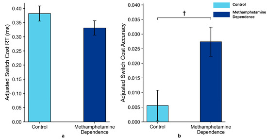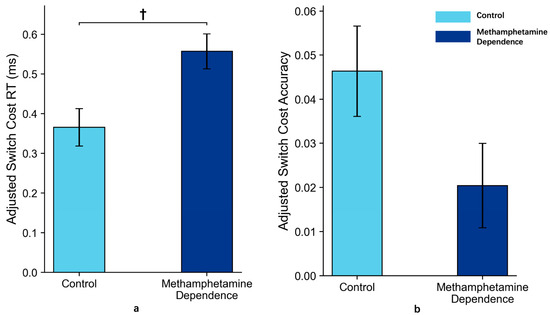 Switch Costs in Methamphetamine Dependence vs. Control Group in Task 1 (M ± SE). Note: Panel (a) shows the reaction time switch costs between the two groups after ANCOVA adjustment for age; Panel (b) shows the accuracy switch costs between the two groups after ANCOVA adjustment for age. Error bars represent standard errors. ‘†’ indicates marginal significance.