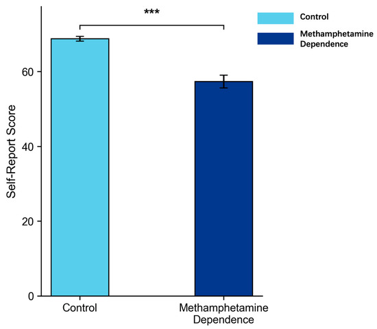 Cognitive Flexibility Inventory Self-Report Scores in Methamphetamine Dependence vs. Control Group (M ± SE). Note: Error bars represent standard errors. *** p < 0.001.