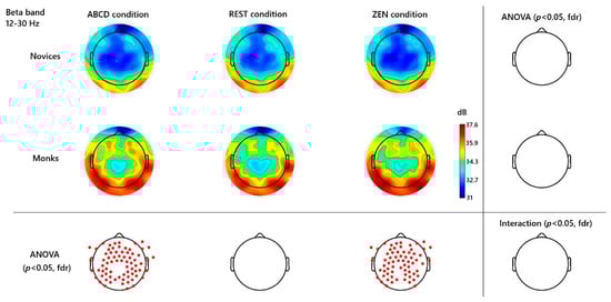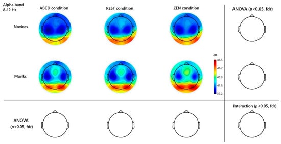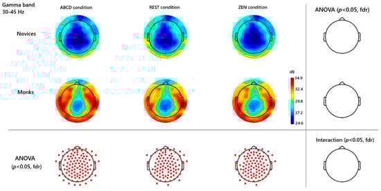 Statistical analysis was performed using a two-way mixed-design ANOVA for each frequency band, with group (Monks, Novices) as the between-subjects factor and condition (ZEN, ABCD, REST) as the within-subjects factor. To correct for multiple comparisons across the 108 electrodes, the False Discovery Rate (FDR) procedure was applied, with a corrected significance threshold set at