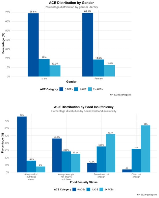 We employed bivariate analysis to reveal systematic relationships between family environment variables and ACE exposure. While overall ACE prevalence showed minimal differences between males (31% with any ACEs) and females (31.5% with any ACEs), child sex (female) emerged as the strongest predictor in the machine learning models. This apparent contradiction suggests that while overall exposure rates are similar, there may be differential patterns in the types of ACEs experienced, reporting behaviors, or co-occurring risk factors between genders that enhance predictive importance beyond simple prevalence rates.