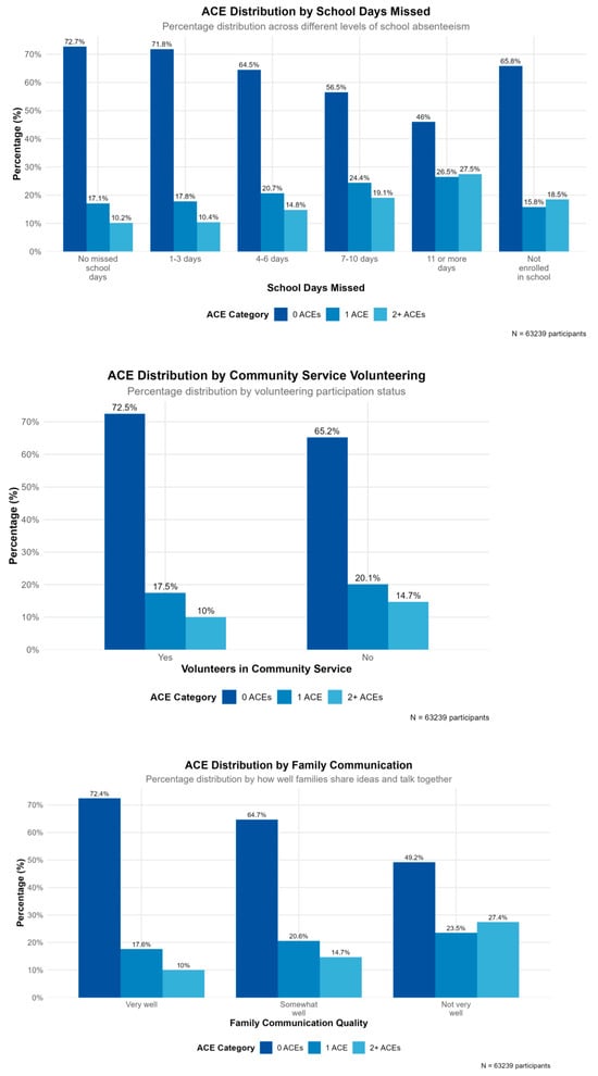 Families reporting regular shared meals and open parent–child communication demonstrated lower rates of ACE exposure. Children engaged in volunteer or community service activities were less likely to report higher levels of adverse childhood experiences (; ). Parent–child communication quality emerged as a significant protective factor. Among school-age children, most demonstrated positive academic engagement, though chronic absenteeism showed strong associations with higher ACE exposure. A complete overview of the bivariate analysis is presented in Figure 1.