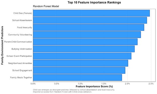 Random Forest feature importance analysis revealed a clear hierarchy of predictive factors for ACE exposure (Figure 2). Child sex (female) emerged as the strongest predictor, followed by school absenteeism as a major behavioral indicator. Food insufficiency represented a critical socioeconomic risk factor, while community volunteering participation served as an important protective factor. Parent–child communication quality functioned as a key family functioning indicator, and bullying victimization reflected significant peer relationship challenges. School event participation indicated community engagement levels, while neighborhood amenities represented environmental factors. School engagement served as an academic risk factor, and family meals together provided an indicator of family cohesion and stability.