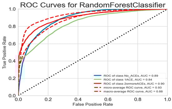 Figure 3 presents strong predictive performance of the Random Forest Classifier in distinguishing Adverse Childhood Experience (ACE) categories, with the highest class-specific ROC-AUC observed for individuals with two or more ACEs (AUC = 0.91), followed by those with no ACEs (AUC = 0.89) and one ACE (AUC = 0.84) (Figure 3). While the model showed excellent overall accuracy, the slightly lower performance for the one ACE group suggests potential overlap in feature patterns. Aggregate metrics further confirmed the model’s robustness, with a micro-average ROC-AUC of 0.93 and a macro-average of 0.88, indicating both high overall accuracy and balanced classification across categories. These results underscore the model’s utility in ACE prediction, particularly for identifying individuals with higher exposure, and highlight opportunities for refinement through feature enhancement or advanced learning techniques.