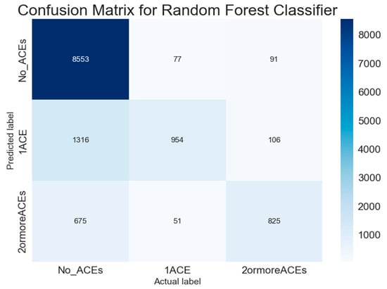 The confusion matrix for the Random Forest classifier reveals important classification patterns across ACE categories (Figure 5). The model demonstrates exceptional specificity for identifying children with no ACEs, correctly classifying 8553 of 8721 cases (98.1% sensitivity), with only 168 cases misclassified into ACE exposure categories.