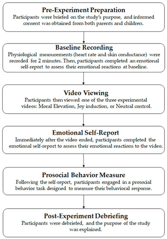 The procedure comprised two sequential phases. First, during the resting phase, participants sat still for two minutes while baseline measures were recorded, followed by completion of self-report measures. Second, in the task phase, participants were randomly assigned to view one of three video stimuli: Moral Elevation (n = 31), Joy (n = 32), or Neutral (n = 29). After viewing, they completed post-exposure assessments. The protocol concluded with an IAT measuring prosocial behavioral tendencies (He & Zhu, 2016). All experimental conditions maintained standardized administration protocols for self-report data collection.