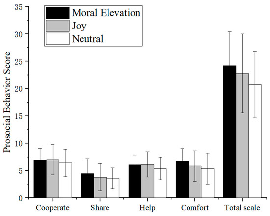 Figure 2 presents the prosocial behavior scores across the Moral Elevation, Joy, and Neutral groups for each subscale (Cooperate, Share, Help, Comfort) and the total prosocial behavior score. The error bars represent the standard deviations of the scores across the groups.