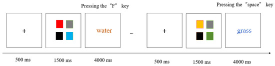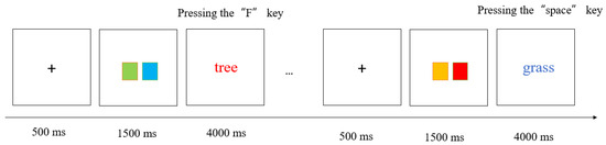 The experimental program was written and run with E-Prime 2.0 on one desktop computer, consisting of a practice phase and a formal experimental phase. At the start of the practice session, instructions for the ongoing task were provided. Each trial of ongoing tasks started with a “+” fixation point, which remained upon the screen for 500 milliseconds before disappearing. Then, Four-color blocks (the high attention load condition, see Figure 1) or two-color blocks (the low attention load condition, see Figure 2) were displayed in the center of the screen, persisting for 1500 milliseconds prior to vanishing. A blank screen was then presented as a buffer for 500 milliseconds. Finally, a colored word appeared, and participants were required to judge whether the color of the word had been presented in the previous color blocks. If it has occurred, participants should press the F key, or they should press the J key. Each word disappeared immediately upon response, with a maximum presentation duration of 4000 milliseconds. All words were selected from the commonly used characters in the first-grade primary school textbook (Volume 1) to ensure familiarity to all participants. The practice session comprises 20 ongoing task trials. If the accuracy of the ongoing task during the practice phase is higher than 0.8, the formal experimental phase can be entered, otherwise the practice will continue.