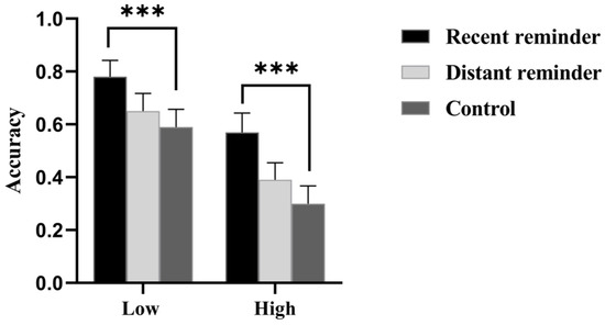 The prospective memory task accuracy. Notes: *** p < 0.001, Low = low attention load, High = high attention load.