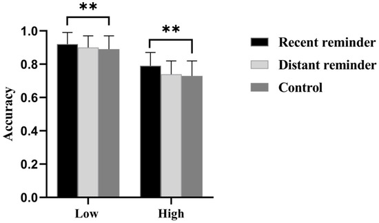An ANOVA was conducted on ongoing task accuracy. The results revealed a significant main effect of reminder conditions, F(1, 164) = 3.65, p = 0.01, ηp2 = 0.04. Post hoc multiple comparisons with Bonferroni correction indicated that the accuracy rate in the recent reminder condition was higher than that in the distant reminder condition (p = 0.03), and the accuracy in the recent reminder condition was also higher than that in the control condition (p = 0.01). In addition, there was a significant main effect of attention loads, F(1, 164) = 125.24, p < 0.001, ηp2 = 0.43. The accuracy under the high attention load condition was lower than that under the low attention load condition. However, the interaction effect between reminder conditions and attention loads was not significant, F(1, 164) = 0.68, p = 0.51 (see Figure 4).