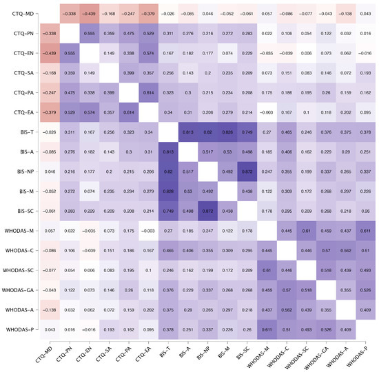 Heatmap of Pearson’s Correlation for trauma, impulsivity, and functioning, adjusted by gender.