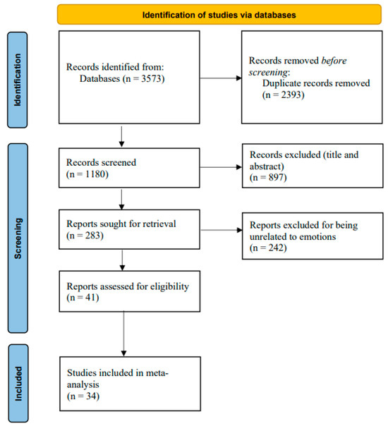 This study followed the PRISMA protocol for systematic reviews and meta-analysis (Page et al., 2021). A systematic literature search was conducted on 30 July 2024 across multiple databases, including Web of Science, EBSCO, ScienceDirect, Google Scholar, Scopus, CNKI, VIP, and Wanfang Data. The study searched articles published in the aforementioned databases from 2010 onwards (Umphress et al., 2010, first introduced the concept of UPB in 2010), using the keywords “unethical pro-organizational behavior” and “pro-organizational unethical behavior” for the English databases, using the keywords “亲组织不道德行为” and “亲组织非伦理行为” (both of these two Chinese keywords refer to unethical pro-organizational behavior) for the Chinese databases. The screening process was conducted by two master’s students majoring in psychology. Both students had systematically studied the knowledge related to meta-analysis, literature searches, and coding, and both possessed the relevant professional expertise. The two individuals independently searched the databases and then combined the search results. The initial search yielded 3573 results, which were reduced to 1180 articles after removing duplicates. Based on the following criteria, (1) publication in SSCI or CSSCI journals; (2) quantitative research design; (3) inclusion of UPB as a core variable, we identified 283 relevant studies through screening titles and abstracts. Further full-text review resulted in the selection of 41 articles focusing on UPB and emotions as core variables. However, a few studies on emotions and UPB were excluded, mainly due to insufficient independent sample sets. For instance, Hao et al. (2023) explored the relationship between depression and UPB, but the research on their relationship only had this one independent sample set, making it impossible to conduct a comprehensive effect estimation, and thus was excluded. Ultimately, 34 eligible studies were included in the meta-analysis. Details of this process follow the PRISMA protocol as outlined in Figure 2.