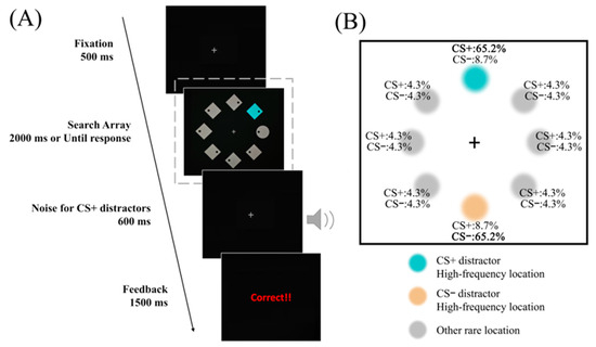 Each participant completed eight experimental blocks, each consisting of 112 trials. The location probability manipulation followed Le Pelley et al.’s (2022) design. Within each block, there were 46 trials with a CS+ distractor, 46 with a CS− distractor, and 20 distractor-absent trials. The order of presentation was randomized within each block to ensure that participants could not predict the occurrence of distractor locations or CS+ and CS− trials. The assignment of the two colors to CS+/ CS− conditions was balanced across participants.
