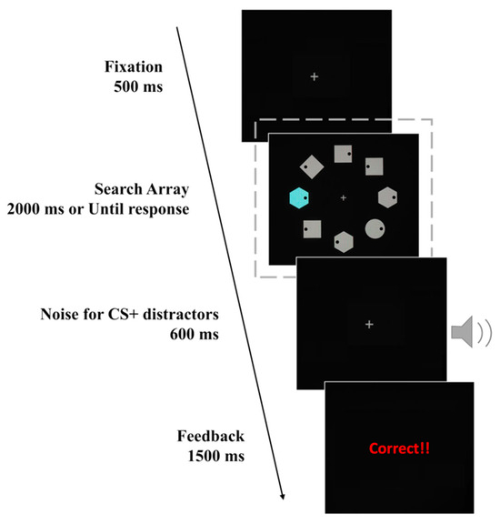 During the display of the stimulus array, a black dot (radius = 0.2°) was randomly positioned 0.8° to the left or right of the center of each item. Participants were instructed to identify the shape singleton (target) and indicate the dot’s location within the target as quickly and accurately as possible. Responses were made using a high-precision response box; participants pressed the left key with their left thumb for a black dot on the left, and the right key with their right thumb for a dot on the right. Reaction times (RTs) were recorded from the onset of the stimulus display. The display remained visible until the participant responded or until 2000 ms elapsed. When the display contained a CS+ distractor, an aversive noise (mean intensity = 54.41 dB, SD = 6.01 dB, the experimental materials are detailed in the database), sourced from the IADS-E database (Yang et al., 2018), was displayed for 600 ms immediately after stimulus offset. When the display contained a CS− distractor, a blank was displayed without noise for 600 ms (Watson et al., 2019). Feedback was then provided for the participant’s response.