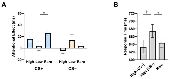 Results in Experiment 2. (A) The mean attentional effects in RTs. The attentional effects were increased in the CS+ condition than in the CS− condition. The effects interacted between the distractor value and location frequency. (B) Raw RTs of the target at three positions when distractors were absent. Error bars indicate SEMs. †, p < 0.09; *, p < 0.05.