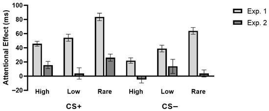 Finally, we compared the attentional effects in Experiments 1 and 2 (Figure 5). A 2 (distractor value: CS+ vs. CS−) by 3 (location frequency: high, low, or rare) by 2 (experiment: Experiment 1 vs. Experiment 2) mixed-effect ANOVA was performed on the attentional effect in RTs. Confirming that the attentional effect is weakened in feature search mode, results revealed that the attentional effect was smaller in Experiment 2 (mean = 9.81, SD = 46.51) compared to Experiment 1 (mean = 51.49, SD = 36.70) (main effect of experiment: F(1, 94) = 62.35, p < 0.001, ηp2 = 0.40, BF01 = 3.39 × 10−4). Critically, the interaction effect across the three factors was marginally significant (F(2, 188) = 2.88, p = 0.059, ηp2 = 0.03, BF01 = 0.96), suggesting that aversive associative learning and statistical learning produced different attentional effects in the two experiments.