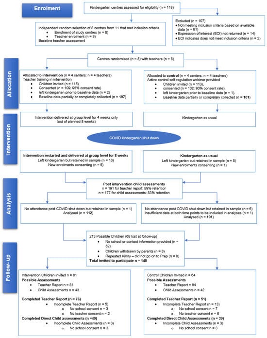 Full details on the study context and sample, and the intervention effects for self-regulation, are provided elsewhere (Bentley et al., 2023; Williams et al., 2023). In brief, this study involved eight kindergarten centers in Queensland, Australia (the year before formal schooling in this jurisdiction). Eight centers were randomized to achieve adequate statistical power at the cluster level while preserving a balanced and feasible design. Based on pilot-derived estimates (Williams & Berthelsen, 2019), accounting for clustering using an anticipated intraclass correlation of approximately 0.03 yielded a design effect of up to 1.9, indicating that the resulting effective sample size was sufficient to detect small intervention effects after allowing for expected consent and attrition rates.