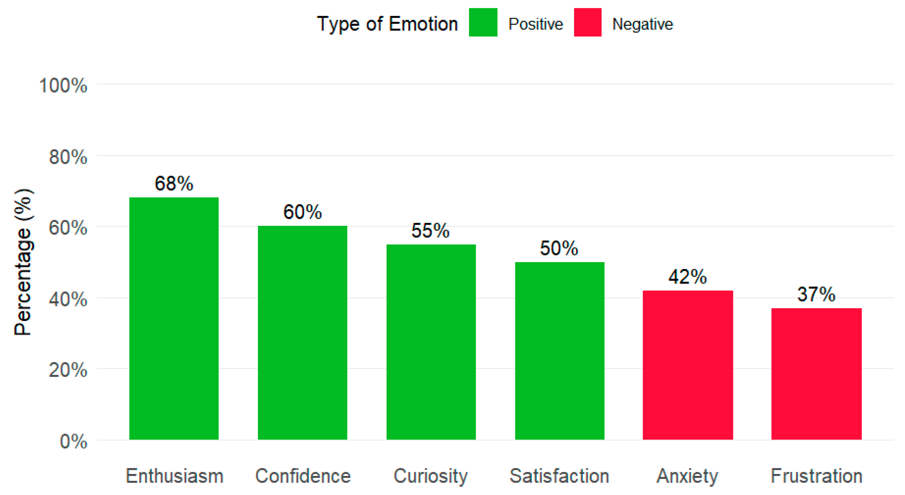 Although the open-ended questions explicitly asked only about “benefits” and “difficulties/concerns,” their open formulation allowed the spontaneous emergence of additional dimensions relevant to RQ3, including emotional reactions (e.g., enthusiasm, curiosity, anxiety, frustration), perceived risks (e.g., plagiarism, reliability concerns), and tensions related to autonomy, dependence, and effort justification. These emergent dimensions were systematically incorporated into the coding scheme.