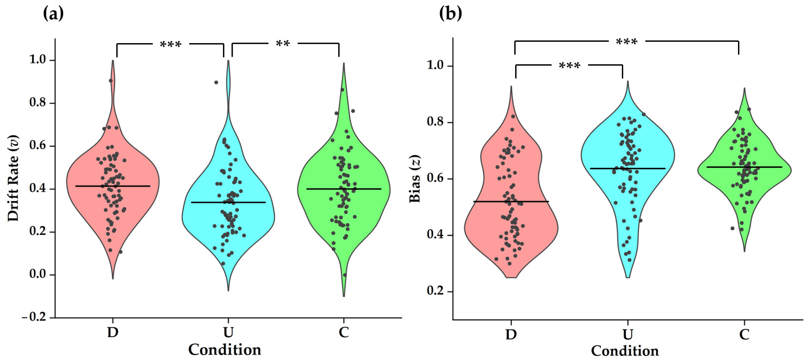 Chicago/Turabian StyleXin, Xiaoyang, Bo Liu, Bihua Yan, and Ying Li. 2026. "Accounting the Role of Prosociality in the Disjunction Effect with a Drift Diffusion Model" Behavioral Sciences 16, no. 1: 132. https://doi.org/10.3390/bs16010132