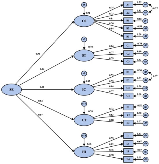 Parameter estimates for the confirmatory factor analysis of the five-factor model. Note. CS stands for higher-order thinking, ST stands for student–teacher interaction, IC stands for active collaborative learning, CT stands for human–computer interaction, and HI stands for enthusiasm for Chinese classroom learning.