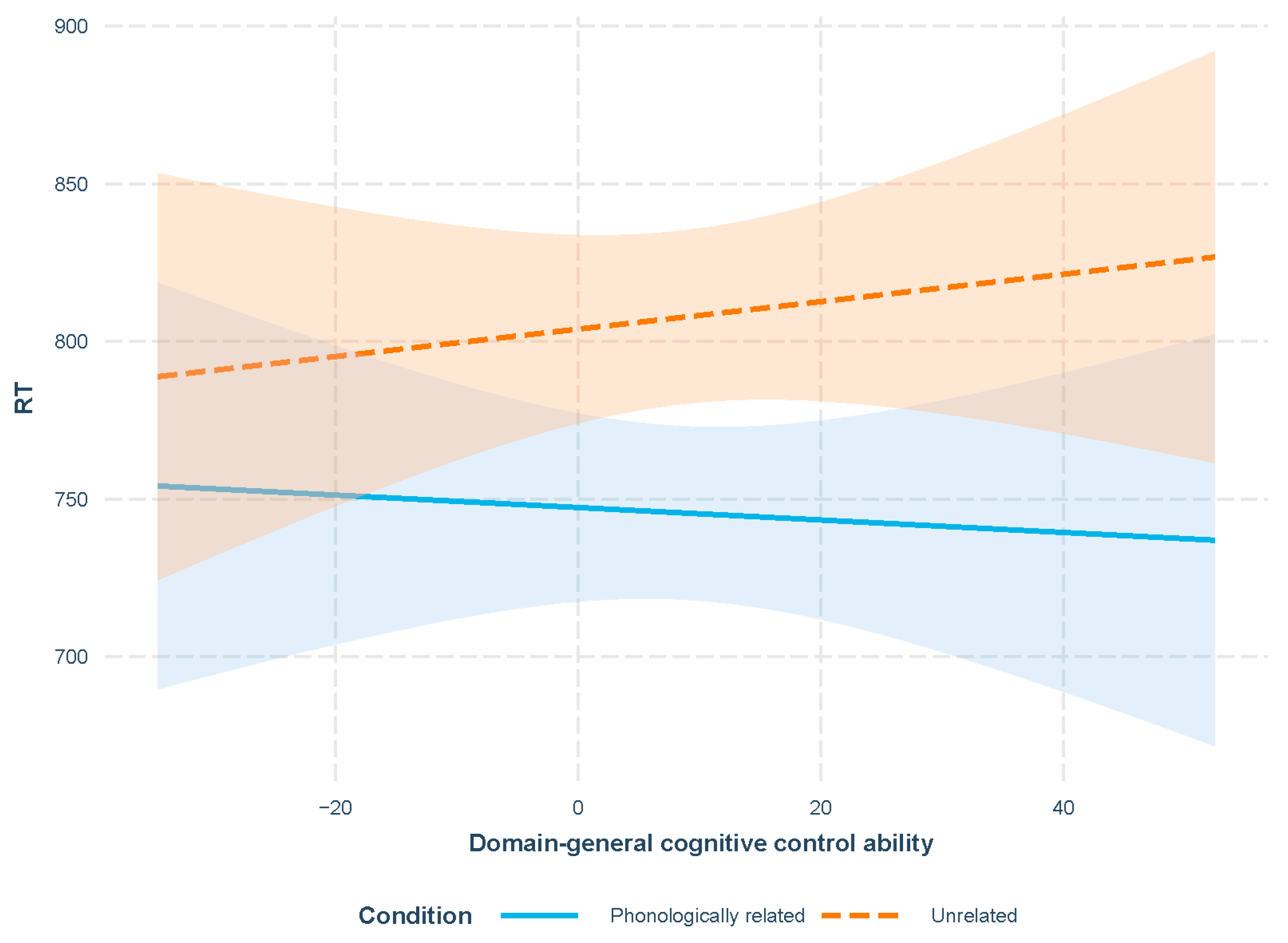 In addition to the facilitation effects, Experiment 2A revealed a significant interaction between cross-language phonological relatedness and domain-general cognitive control ability. Specifically, as the participants’ domain-general cognitive control ability increased, the magnitude of the cross-language facilitation effect in L2 production became significantly larger. Notably, this interaction was absent in Experiment 2B, which is an L1 production task. As hypothesized in prior analyses of Experiment 1B, the interaction likely reflects the involvement of proactive control. For the participants, L2 functions as the non-dominant language, meaning L2 production tasks are perceived as more cognitively demanding than L1 production tasks. This heightened perceived difficulty made participants proactively allocate greater cognitive effort to maintaining the task goal in L2 tasks, resulting in a detectable influence of domain-general cognitive control ability in L2 production but not in L1 production.