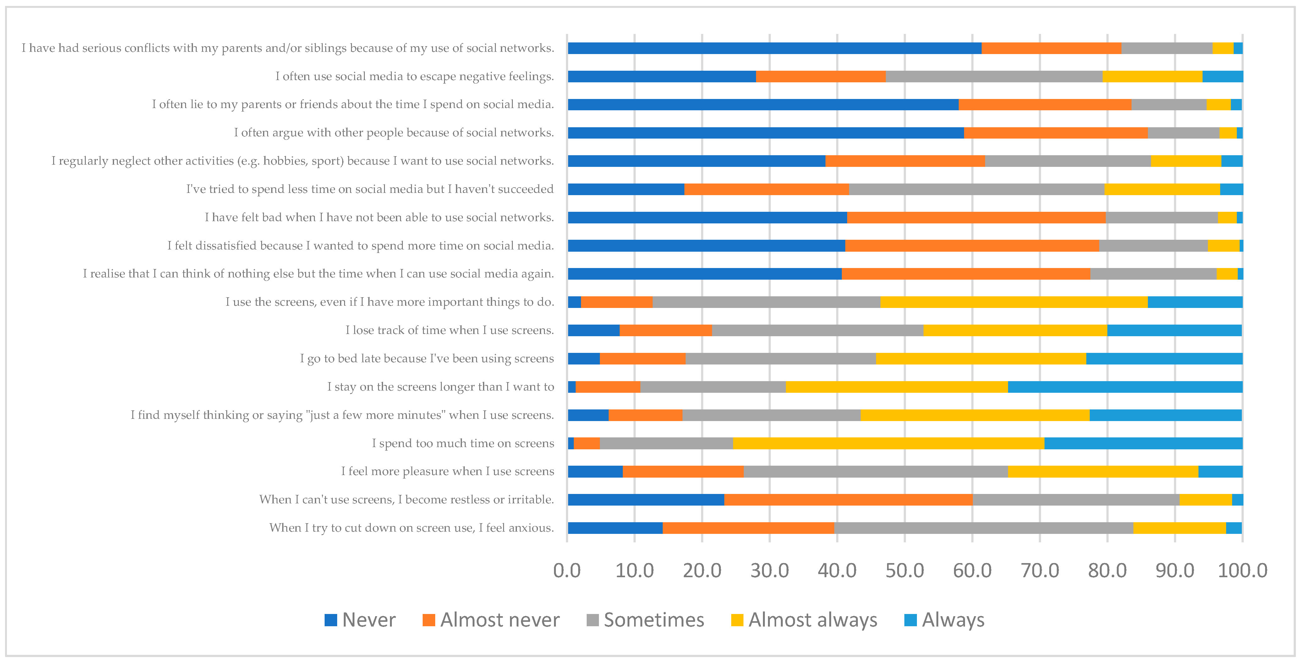 - van den Eijnden, R. J. J. M., Lemmens, J. S., & Valkenburg, P. M. (2016). The social media disorder scale. Computers in Human Behavior, 61, 478–487. [Google Scholar] [CrossRef]