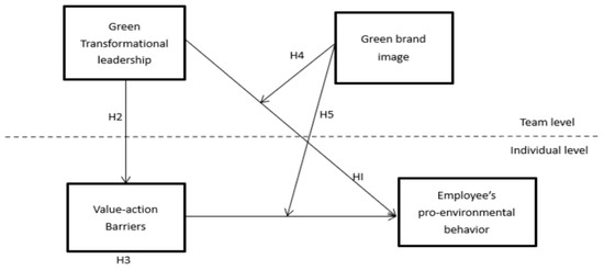To summarize the theoretical framework of the present study, Figure 1 depicts the proposed research model and the hypothesized relationships among green transformational leadership, the value–action barrier, green brand image, and employee pro-environmental behavior across the team and individual levels.