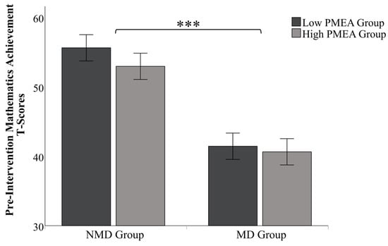 To validate the experimental groups, a 2 (child type: MD, NMD) × 2 (PMEA level: low, high) ANOVA was conducted on the pre-intervention T-score (see Figure 1). The analysis confirmed a significant main effect for child type [F (1,116) = 192.240, p < 0.001, ηp2 = 0.624], with NMD group children (M = 54.28, SD = 4.57) scoring significantly higher than MD group (M = 41.04, SD = 5.91). This finding validates the operational definition of the child type classification. Crucially, the main effect for PMEA level, while not significant at the α = 0.05 threshold, was found to be marginally significant, [F (1,116) = 3.305, p = 0.07, ηp2 = 0.03]. This suggests a potential pre-existing difference in mathematics achievement between children of low- and high-anxiety parents. The interaction effect between child type and PMEA level was not significant, [F (1,116) = 0.946, p = 0.333, ηp2 = 0.008]. This lack of interaction demonstrates that there were no significant differences in baseline achievement between children of high- and low-anxiety parents within either the MD group or the NMD group. Despite the absence of significant differences within each child type subgroup, the overall marginal significance of the PMEA main effect warranted a cautious approach. Therefore, to control for any potential confounding influence of baseline scores, it was deemed necessary to include the pre-intervention T-score as a covariate in the subsequent analysis of intervention effects.