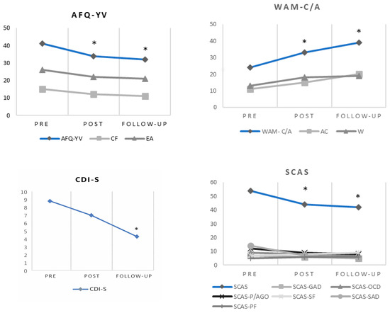 These results were maintained at the 3-month follow-up. Decreases in experiential avoidance (EA), cognitive fusion (CF), depressive symptomatology (CDI-S), and most of the anxious symptomatology subscales (SCAS) were observed. Moreover, increases in willingness (W) and committed actions (CAs) were observed. These improvements in scores on the AFQ-YV and the WAM-C/A between the pretest and the follow-up represent a clinically significant recovery.
