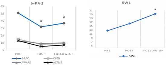 After the intervention, a reduction in scores was observed on all the subscales of parental PI (6-PAQ), especially in difficulties in maintaining a committed response style (active). On the other hand, an increase in life satisfaction (SWL) was observed compared to the initial assessment, which could be interpreted as “slightly unsatisfied”, although this result did not reach a significant difference. Scores at the 3-month follow-up show a slight increase in PI with respect to the post-test; this increase indicates a clinically significant recovery. Life satisfaction at follow-up shows a further increase to a mid-range score, and this change represents a clinically significant recovery.