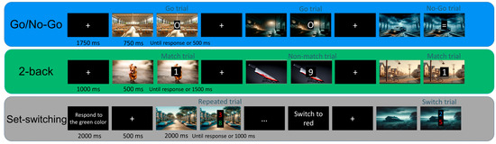 Flowchart for Go/No-Go, 2-back and set-switching task. The numbers shown in the flowchart represent the task stimuli. In the 2-back task, participants judged whether the current number matched the one presented two items earlier, whereas in the set-switching task, they determined whether the number displayed in the target color was odd or even.