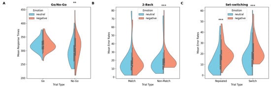 Violin plots of mean response times (Go/No-Go) and mean error rates (2-back, set-switching) for neutral and negative emotional conditions: (A) Go/No-Go, (B) 2-back, (C) set-switching (p < 0.01 **; p < 0.001 ***).